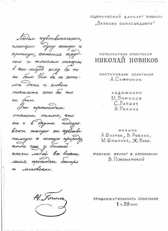 Программа спектакля «Сумасшедший» по произведению Н.Гоголя.