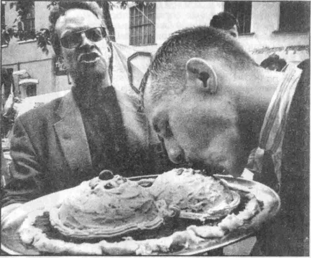 Нынешнее съестное изобилие наглядно доказали бицепсы Александра Невского. А ведь пятнадцать лет назад за большое счастье почиталось отовариться килограммом сосисок. Теперь в "Парке Мерилин" ими были увешаны даже деревья и, конечно, изваяние самой Монро. Возле него раздавала автографы "self-секс-символ" 80-х Елена Кондулайнен. Она пришла напомнить об этом. Хотела даже решиться на стриптиз. Но тут вынесли поднос с бюстом Мерилин Монро из взбитых сливок, вызвавшим неописуемый восторг публики. Особенно возможностью к нему приложиться. Многим в этот вечер досталось и более ценное — собственный портрет, нарисованный художником Михаилом Борисовым кетчупом на лаваше.